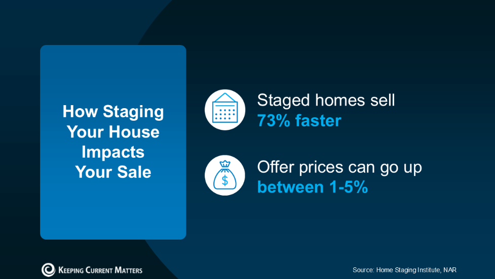 Studies show good staging does have an impact on your sale. Staging your house well can help you attract more attention from buyers, which ultimately helps it sell faster and maybe for a higher price than an unstaged home (see visual):